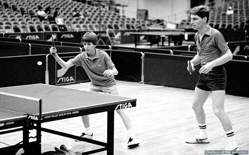 We’ll pick up Adelphi, Maryland’s Larry Hodges when he’s 16, a miler on his high school track team, and ambitious enough to go to the local library for a book on Track & Field. In the stacks, “I happened to look to my left,” he said, and there was a book on table tennis, ‘The Money Player,’ by Marty Reisman! I had been playing basement ping-pong at a neighbor’s house, and spur-of-the-moment checked the book out.” Perhaps, Larry thought, this fellow Reisman was a spokesperson for the USTTA, for through the book he was made aware of the Association, and, on contacting them, he was directed to a local club.